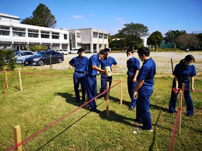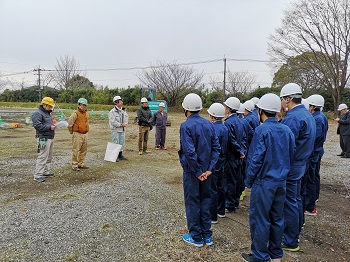 12月10日(月)、朝9時から12時まで、熊本県鳶工業組合連合会の方々においでいただき、「土工事」の授業をしていただきました。当日は寒波によりかなり冷え込んでおり、みんな完全防備で授業に挑みました。