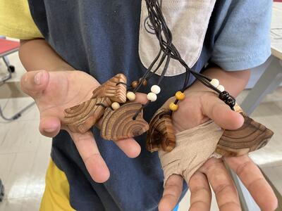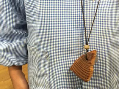 3種類の紙やすりで一生懸命木片を磨き、つるつるになったら米油を仕上げに塗り、ひもとビーズを通して完成です!
