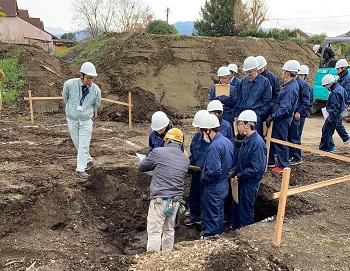 内容は、実際に使用されている道具(建設機械)を使い、基礎やり方出し~床堀~埋め戻しまでを見学しました。レベルやトランシットを使って測量する時の合図の仕方や、バックホーを使って床堀や埋め戻しをするプロの技に、「スゴイ!」とか「カッコイイ!」という声が上がっていました。