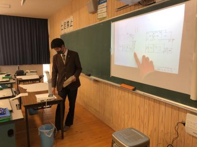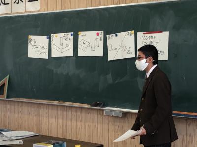 発表会では平面図を黒板に拡大表示させながら、施主の希望をどのように図面にしたか、どんな工夫をしたかを発表しました。