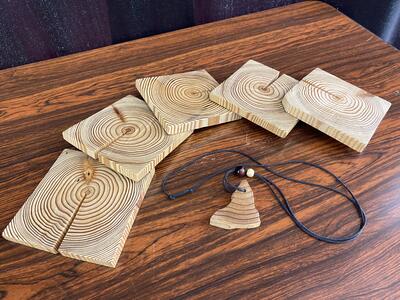 作品は、ペンダントやコースター、積み木や筆箱などを作りました。