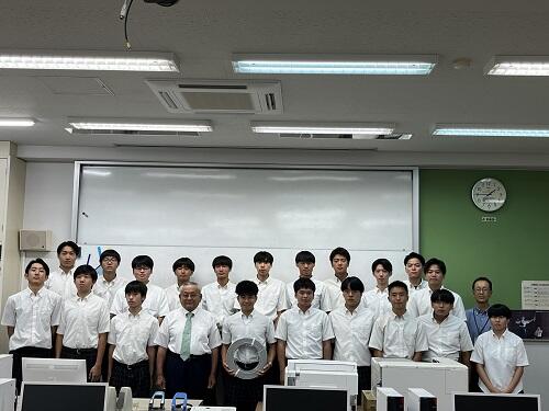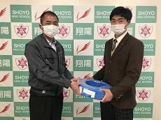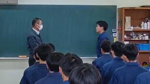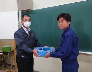 工業系列電気電子2年次生(一部3年次生)は、12月に第二種電気工事士技能試験を控えており、連日対策授業に取り組んでいます。その際、多くの電線ケーブルを消費しますので、今回の寄贈は大変助かります。誠にありがとうございます。系列を代表して2年次の小野君が謝辞を述べました。