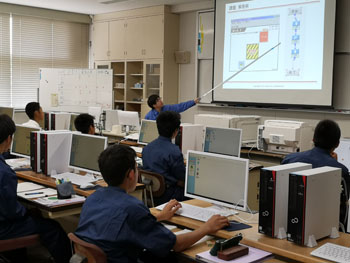最後に3年次の建築製図です。これは木造2階建て平面図を書いている写真です。3年次では他に木造の各伏図や鉄筋コンクリート造3階建ての図面も書きます。また実習ではパソコンを使用し作図を行うCADを取り入れております。3年次では2年次で習得した知識を応用することが求められ、社会に出ても適用する人材を育てていきます。