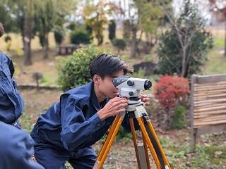 2年次で開講される「建築実習α」では、次の3つのテーマを4週(8時間)ごとにローテーションします。テーマは、「手作業による木材加工」「レベル測量」「平板測量」です。建築における基本的な内容なのでみんな真剣に取り組んでいます。