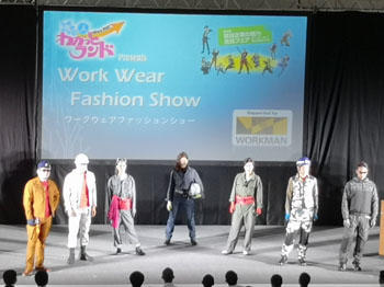 次にワークウェアファッションショーを見ました。工事現場で働いている方の負のイメージを払拭すべく、作業着メーカーの方は若い人が普段着にしてもオシャレに見えるデザインの作業着を販売しているそうです。会場ではプロのモデルやスタイリストの方の着こなし方を間近に見ることができました。