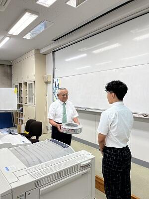 松本様の「次世代を担う電気技術者育成の一助となれば」との強い思いから、今回の運びとなり、工業系列(電気電子)を代表して3年次の浜谷さんと上野さんがお礼の言葉を述べました。