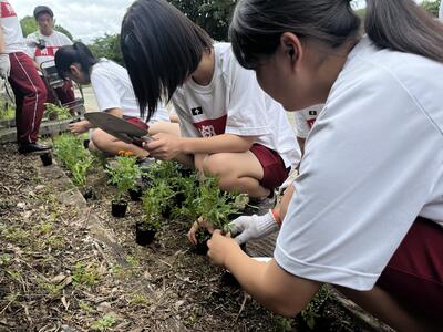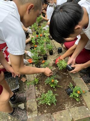 3年次の選択科目「ガーデニング」で校内の花壇にマリーゴールドを定植しました。