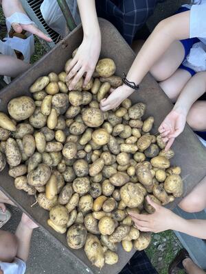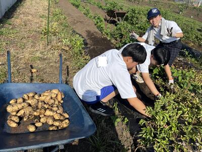 1年次生の選択科目「農業と環境」で3月に定植したジャガイモが収穫の時期を迎えました。ゴロゴロ出てくるジャガイモを楽しそうに掘る生徒たち