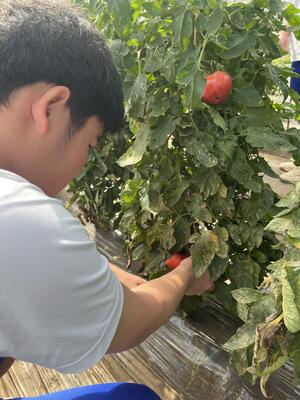 2年次生のグリーンデザインではトマトの観察を行っています。真っ赤に実ったトマトを収穫し、口いっぱいに頬張る生徒たち。「家で食べるより甘い」と言う生徒もいました。スケッチしてトマトの構造を知りながら、仲良くみんなで食べていました。
