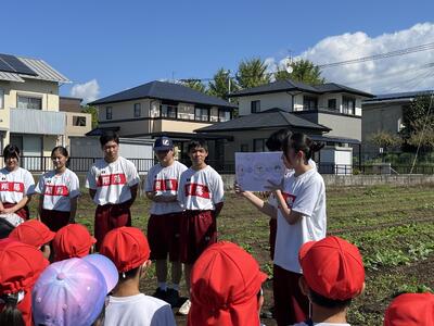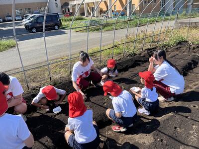高校生が手本を見せて、児童の皆さんがそれを真似して種をまきました。