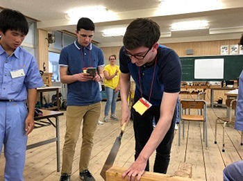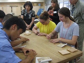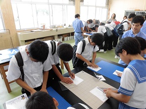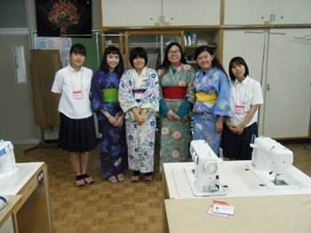 歓迎セレモニーの後、3年次生が取り組んでいる「総合的な学習の時間」に合流して木育ペンダントの製作、盆景づくり、浴衣の着付けを体験しました。