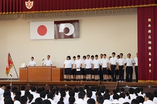 最初に表彰式が行われ31人が表彰を受けました。次に、農業クラブ全国大会・全九州高校陸上競技大会に出場する4人の代表生徒の推戴式が行われました。終業式では、校長から前期の締めくくりとして「①挨拶をしよう、②他人が見ていない時の行動、③目標を持って努力する」3つの事を実践するように式辞がありました。