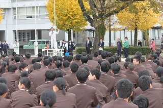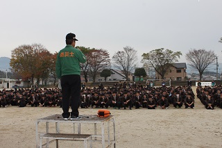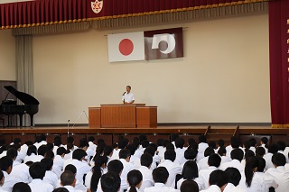 集会に先立ち、熊本地震で亡くなられた方々への黙祷、副校長挨拶、防災主任講話の後、生徒代表「誓いの言葉」の中で、生徒会長が2年前の支援物資の運搬や地域ボランティアの経験を活かし、災害に備えての避難経路の確認・非常食の確保・災害に対処する心構えを力強く訴えて終了しました。