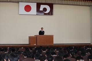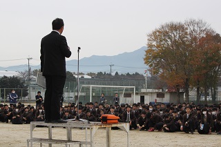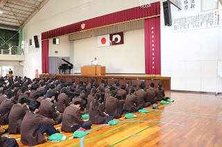終業式では、校長から今年度の目標の「①自ら気づき、考え、行動する②5S活動の実践③学業の精励」を次年度も引き続き実践するように式辞がありました。