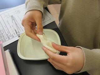 小麦粉に含まれているタンパク質「グルテン」を取り出してみました。A・B2種類の小麦粉に水を加えて捏ねた後、水の中でもみ洗いしてグルテンを取り出す実験を行いました。このグルテンはどのような働きをもたらすのか。食品製造の加工においてどのような特性があるのか。今回はグルテンを取り出すまででしたが、これからの学習でさらに深く理解していきましょう。