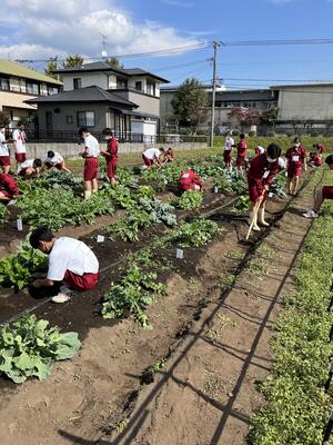 除草作業にも一生懸命取り組みます。終わった人は終わっていない人の手伝いもして、協調性も育んでいます!