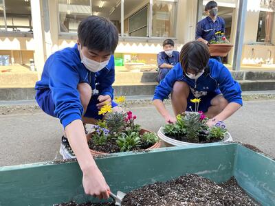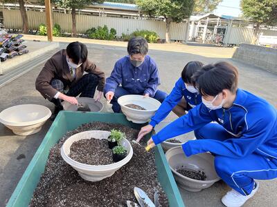 3年次のオープン科目「ガーデニング」の授業で寄せ植えを作りました。花材は同じですが、配置する場所や色で雰囲気が違ったものを作ることができました。文化祭で展示した後は家に持ち帰って綺麗に飾って欲しいです。「祖母がお花好きなので、プレゼントしたいです!」とニコニコした笑顔で寄せ植えを作っていました。