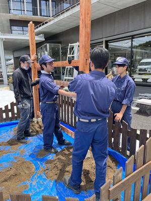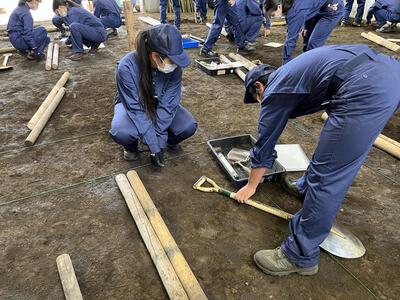 柱を立てるために穴を掘ります。なかなかの深さを掘るので2人で交代しながら取り組みました。