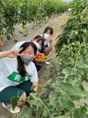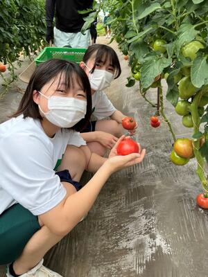 2年次生のグリーンデザインではトマトの観察を行っています。真っ赤に実ったトマトを収穫し、口いっぱいに頬張る生徒たち。「家で食べるより甘い!」と言う生徒もいました。ミニトマトと大玉トマトの比較をしながら、仲良くみんなで食べていました。