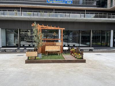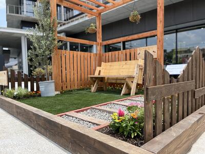 2日間に分けて、枠づくり、砂入れ、パーゴラ設置、草花植えなどを行いました。