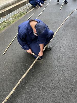 丸太に竹を取り付けていきます。先生の説明を受けて、自分たちでやってみます。