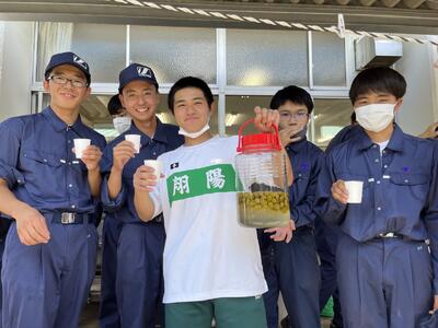 4月下旬にウメの収穫を行った時に、梅ジュースを仕込んでいたので、実習後に試飲をしました。梅雨が明け、暑くなって来ている中、実習を行った後だったので、キンキンに冷えている梅ジュースは格別に美味しかったです。