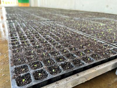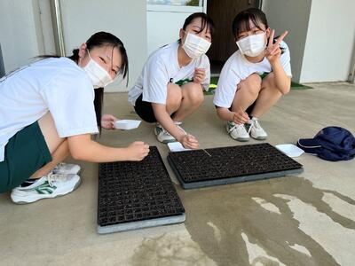 2年次生の学校設定科目グリーンデザインの授業で、8月25日(木)ビオラの播種を行いました。初めて見る種の大きさや播種の仕方に戸惑いながらも1粒ずつ丁寧に播種することが出来ました。29日(月)には芽が出ていました!今年も発芽率が高かったです。セルトレーの中で大きくなったら、鉢上げを行い、大きな苗に仕上げます。