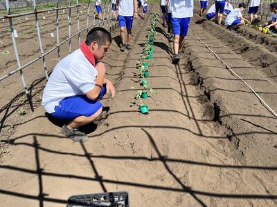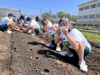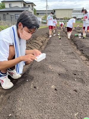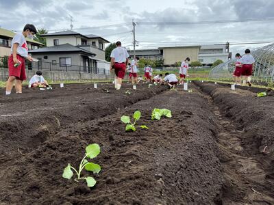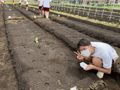 ハクサイ・ダイコン・ジャガイモ・ニンジン・レタスなど自分で育ててみたい野菜を調べ、種を撒きました。種の深さは?種と種の間は?たくさんの疑問を持ちながら事前に調べた畑のスケッチを基に播種・定植することができました!