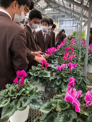 3年次の選択科目「ガーデニング」でシクラメンを1人5鉢ずつ栽培しました。自分たちで育てたシクラメンの中から好きな鉢を1鉢、自宅へ持ち帰り管理してもらいます。どのシクラメンにしようかじっくり選んでいました。