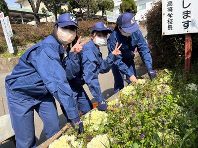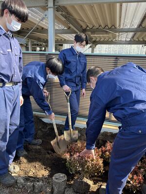 蔓延防止措置で、なかなか授業ができずオンラインが多かった2月でした。今日は久しぶりに外で5班に分かれて実習を行いました。恥ずかしながら、草が伸びきっていた花壇も実習後は綺麗になりました!今日は気温も高くポカポカ陽気でした。みんなで一緒に汗を流しながら実習できる、当たり前の日々が早く来ることを願うばかりです。
