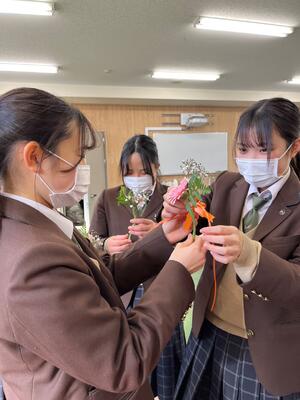 2月28日に卒業生へ在校生がコサージュを手作りしました!農業系列、家庭系列、生徒会などを中心にコロナ過で密にならないように行いました。感染予防の為、事前練習などが出来なかったのですが、卒業生への想いを込めながら1つ1つ丁寧に作ることができました。作成した2年次生は、「とても楽しかったです。来年、私たちも貰えるのかな~」と嬉しそうな表情をしていました。3年次生のみなさん、卒業おめでとうございます!
