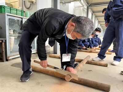 2年次生になり、初めて実習服に袖を通す生徒たち。早速、造園技能検定の練習を行いました。実技では竹や石などを使って小さな庭園を作ります。今日は、丸太を水平にしてノコギリで真っ直ぐ切る練習をしました。ノコギリの使い方に慣れていない人もいましたが、綺麗に切ることができました。