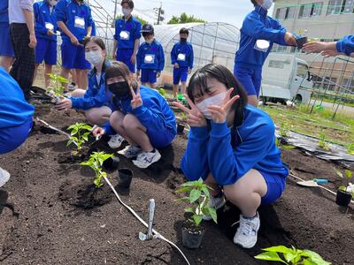 1年次生のオープン科目「農業と環境」の授業でナス・ピーマン・トマトの夏野菜の苗を定植しました。