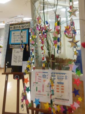 スイカや朝顔が表紙の本、甲子園、夏休みの物語から夏のおすすめスイーツまで夏にぴったりな本を揃えました。七夕飾りも3年生図書委員が飾ってくれました。
