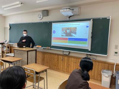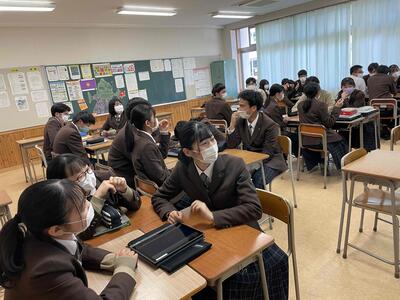 12月22日(水)の2年次「総合的な探究の時間」で、クラスの代表によるインターンシップ年次発表会をしました。今年は、ICT機器も充実してきたので、物理室で発表を行い、自分のホームルームで聞くという形式を取りました。 教室での準備は総探委員の生徒が行い、カメラに向かって発表をするというオンラインでの発表も慣れてきました。