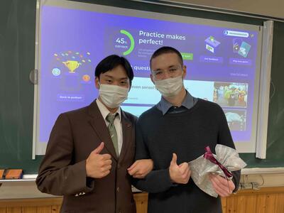 今日の5限目『英語表現Ⅱ』の時間は、外国語指導助手 スティーヴン先生の翔陽高校での最後の授業でした。"Steven Proficiency Test"(スティーヴン先生検定)と題し、スティーヴン先生に関するクイズゲームを実施しました。タブレット端末を用いてグループ対抗戦で検定に臨み、優勝チームの4人が認定証をもらいました。