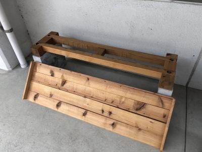 3年次の実習でコンクリート製の脚を、2年次の実習で木製の座面を作成し、それらを合体させた物になります。