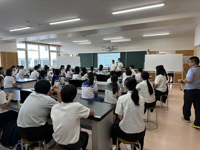 7月23日(火)に「中学生体験入学」(オープンスクール)を開催したところ、県内からここ数年で最も多い中学生と保護者(約680名)に参加していただきました。全体会では、総合学科や高校入試に関する説明や本校生による体験発表などがあり、その後、事前に希望した系列に分かれての模擬授業を2コマ体験してもらいました。