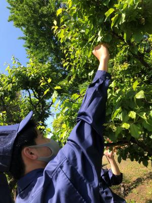 脚立に登って、丁寧に収穫を行うことができました。「梅ジュース飲みたいな~」等と生徒たちの声が聞こえてきました。真夏の実習後に飲む梅ジュースはおいしいはず!!