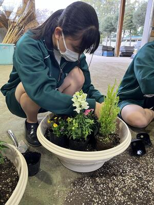3年次のオープン科目「ガーデニング」の授業で寄せ植えを作りました。花材は同じですが、配置する場所や色で雰囲気が違ったものを作ることができました。