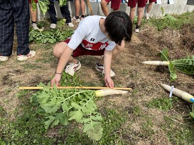 グリーンデザインで育てたダイコンを収穫しました!このダイコンは種まきから観察・調査をしてきたダイコンです。女子生徒はダイコンを引き抜くのに力がいるので、「抜けなーい!」と言いながらも抜いた後は「大きいでしょう♪」と自慢気に話していました。抜いた後は葉っぱの枚数、長さ、重さをはかりグラフにしていました。