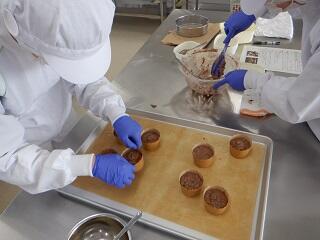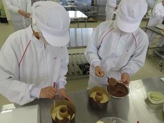はじめてのチョコレートを使った菓子製造でした。温度管理や分離に気を付けながら手際よく作業できており、ふんわりしっとりにできあがりました。