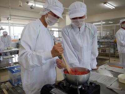 食品製造2年次生が、初めての持ち帰り製造実習を行いました。初回は、「イチゴジャム」の製造でした。作ることの楽しさと食べてもらう人のことを考えて、衛生面に気をつけながら実習を行うことができました。