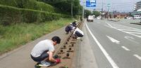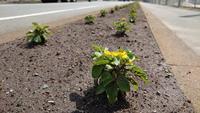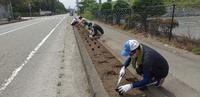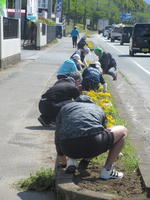 学校正門前の花壇は全長1,000mあります。例年、グリーンデザインという教科で2年次の生徒とともに管理を行っています。4月末に職員で撤去し、5月中旬のこの日、先生方の協力のもと、メランポジュームの花の苗を植え付けました。この花を見て、この道を通る人たちみんなが笑顔になれることを願っています。