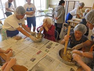 農業系列食品製造では、発酵調味料として「麦みそ」と「しょうゆ」を製造しています。日頃は大型機械で製造していますが、この日は人生の先輩方と蒸した大豆をめん棒や手でつぶしながら麹と混ぜていくなど手作りでの笑顔満載の体験でした。次回は、熟成したみそを使った試食体験を行う予定です。