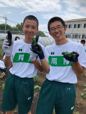 1年次生の農業と環境では一人一畑を行っていますが、どんどん野菜の収穫ができています。今日はナス、ピーマン、ズッキーニ、トマトなどの収穫を行いました。「1週間でこんなに大きくなるのは感動!」「お母さんが喜びます!」と嬉しそうに収穫をしていました。家でどんな料理になるのか楽しみですね♪