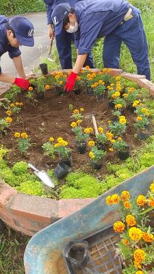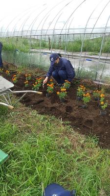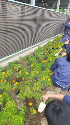 2年次の総合実習で校内にある花壇とビニルハウスの脇にマリーゴールドの苗を植えました。
