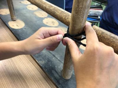 いぼ結びは垣根を作るときに行われる結び方です。やや複雑な結び方ですが、何度も練習するとキツく固く美しく結ぶことができます。久しぶりのいぼ結びで、やり方を忘れた生徒もいましたが、思い出しながらしっかり結ぶことができました。