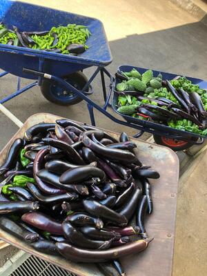 3年次の選択科目「生物活用」では畑の一角で、小玉スイカ・ピーマン・ブロッコリー・オクラ・シシトウ・ピーマン・などの夏野菜を栽培しています。毎時間除草ばかりでしたが、最近収穫が増えてきました。