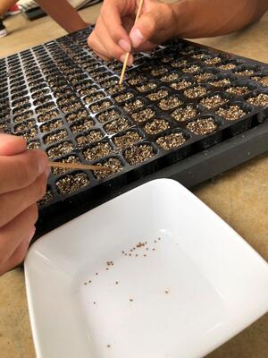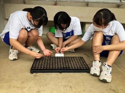 8月26日(木)グリーンデザインと園芸・造園を選択している生徒でパンジーの播種を行いました。花の種の中では大きな方ですが、初めて播種をする生徒は「小さい-!!」とびっくりした様子でした。一粒一粒、竹串でセルトレーに丁寧に播種することができました。11月頃に学校前の花壇や地域の方へ販売ができるように管理していきたいです。